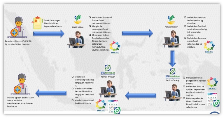 Ina menjelaskan bahwa peserta PBI JK yang dinonaktifkan dan membutuhkan layanan kesehatan dapat mengajukan permohonan melalui Dinas Sosial setempat dengan mekanisme yang diawali dari desa/kelurahan. Proses verifikasi terhadap pengajuan data reaktifasi menjadi kewenangan Dinsos dan Kemensos. Selanjutnya jika data tersebut telah disetujui oleh Pusdatin Kemensos maka BPJS Kesehatan dapat melakukan aktifasi terhadap data yang telah di setujui oleh instansi terkait.