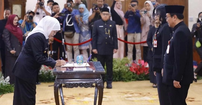 Gubernur Khofifah Indar Parawansa saat melantik Prof Cita Rosita Sigit Prakoeswa sebagai Direktur RSUD Dr. Soetomo di Gedung Negara Grahadi, Surabaya, Rabu 22 November 2023. (Foto: Istimewa)
