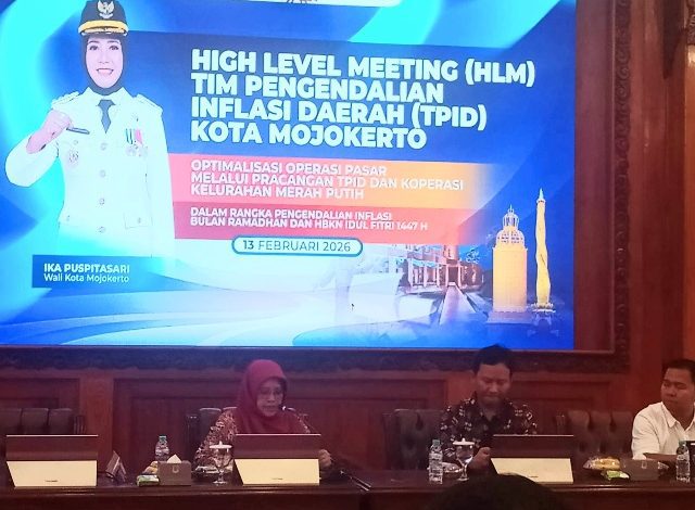 MOJOKERTO, BIDIKNASIONAL.com – Pemerintah Kota (Pemkot) Mojokerto menggelar sinergitas High Level Meeting (HLM) Tim Pengendalian Inflasi Daerah (TPID) di Sabha Mandala Madya Balai Kota Mojokerto, Jumat (13/2).