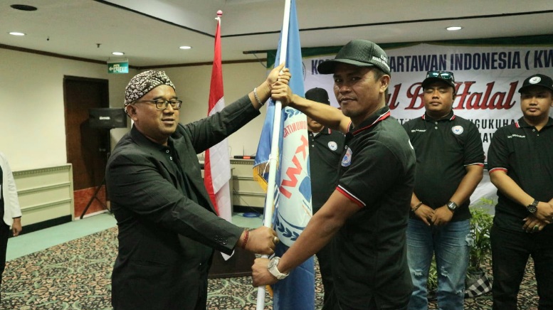 PELANTIKAN: Penyerahan bendera pataka oleh Umar Hayat selaku pimpinan pusat KWI (kiri) kepada Abd. Rosi wartawan dari Media bidiknasional.com sebagai Ketua DPC KWI Kabupaten Bangkalan di Hotel Sahid, pada Minggu (26/04/2026). Foto: istimewa