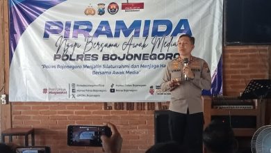 Kapolres Bojonegoro AKBP AFRIAN SATYA PERMADI, SH, SIK, saat memberi sambutan dalam acara Piramida dan cangkrukan dengan insan Pers. (Foto:…