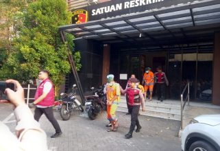 Penyidik Unit II Subdit III Tindak Pidana Korupsi Ditreskrimsus Polda Jatim saat keluar dari ruang penyidikan Polsek Babat, Lamongan. (Foto.…