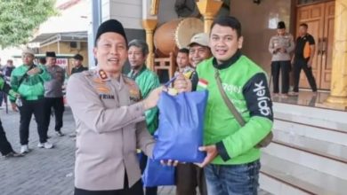 Kapolres Bojonegoro, AKBP Afrian Satya Permadi menyerahkan paket sembako kepada perwakilan pengemudi ojol yang hadir dalam kegiatan tersebut (Foto: ist)…